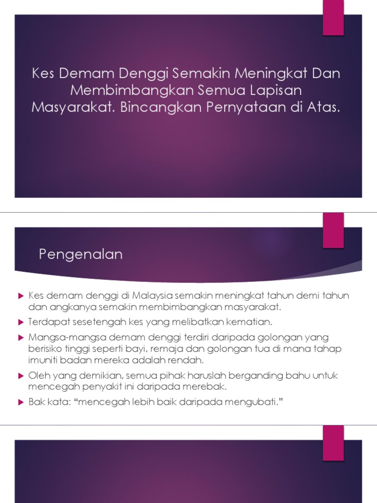 Faktor pencegahan demam denggi. Penutup Karangan Punca Penyakit Deman Denggi Secara keseluruhannya mencegah itu lebih baik daripada merawat maka kita hendaklah mengambil pendekatan yang lebih efektif lagi drastik dalam menangani masalah demam denggi yang masih belum ketemu titik penyelesaiannya. Kini terlalu banyak kaedah pengawalan dan pencegahan denggi yang diperkenalkan tetapi kes denggi tetap meningkat di Malaysia.