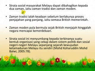 Sejarah F2 Struktur Sosial Kerajaan Alam Melayu By IsmiIffahFaqiehah Updated. Struktur Politik Ekonomi dan Sosial Dalam Masyarakat Melayu Tradisional Authors. Strata Sosial Masyarakat Melayu Tradisional Secara umumnya masyarakat Melayu tradisional dapat didefinisikan sebagai satu gambaran orang Melayu yang mengamalkan sesuatu adat istiadat kebiasaan yang telah sebati dan kekal secara turun temurun dalam kehidupan mereka.